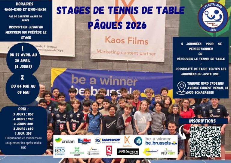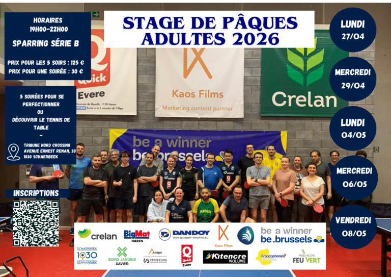 “Club de tennis de table de Bruxelles de haut niveau bénéficiant d’une école des jeunes performante, chouette local avec 8 tables fixes au Crossing de Schaerbeek